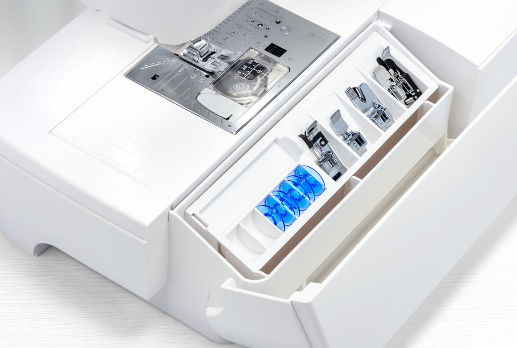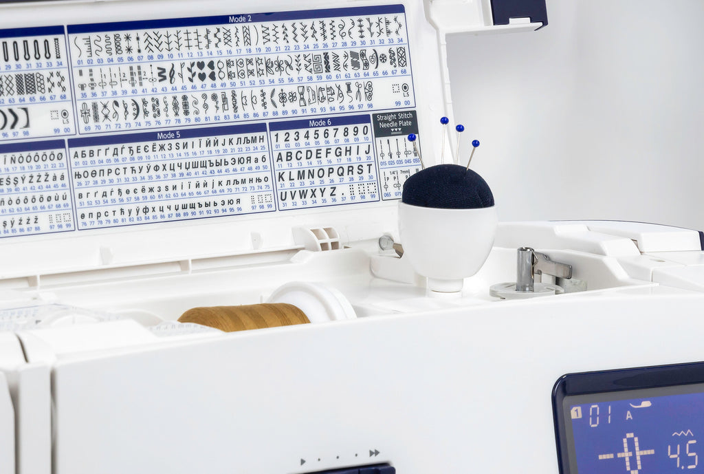 L'écran LCD facile à lire offre un accès direct aux 196 points (jusqu'à 9 mm de large) et aux 10 boutonnières en une seule étape. Personnalisez vos projets et vos points grâce aux quatre polices intégrées. Pour une couture plus facile et plus lumineuse, la Skyline S6AE est équipée de six LED lumineuses réparties sur trois emplacements et d'une genouillère réglable pour lever le pied-de-biche en mains libres. L'enfile-aiguille performant, le coupe-fil automatique, les boutons de marche arrière et de point noué facilitent la couture.